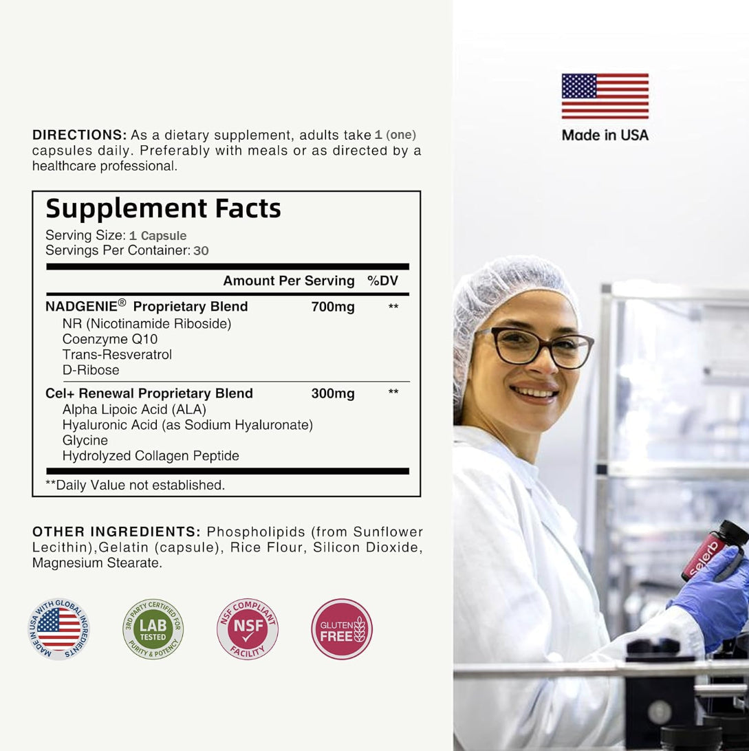 Support graceful aging and vibrant energy with a daily NAD+ supplement designed to replenish what naturally declines over time. This advanced formula combines liposomal NAD+ with synergistic ingredients like glycine, Q10, resveratrol, and hyaluronic acid to help restore skin elasticity, enhance energy production, and support DNA repair at the cellular level. Whether you’re looking to boost your focus, fight fatigue, or maintain youthful skin, this all-in-one daily capsule helps you feel like yourself again—only better.